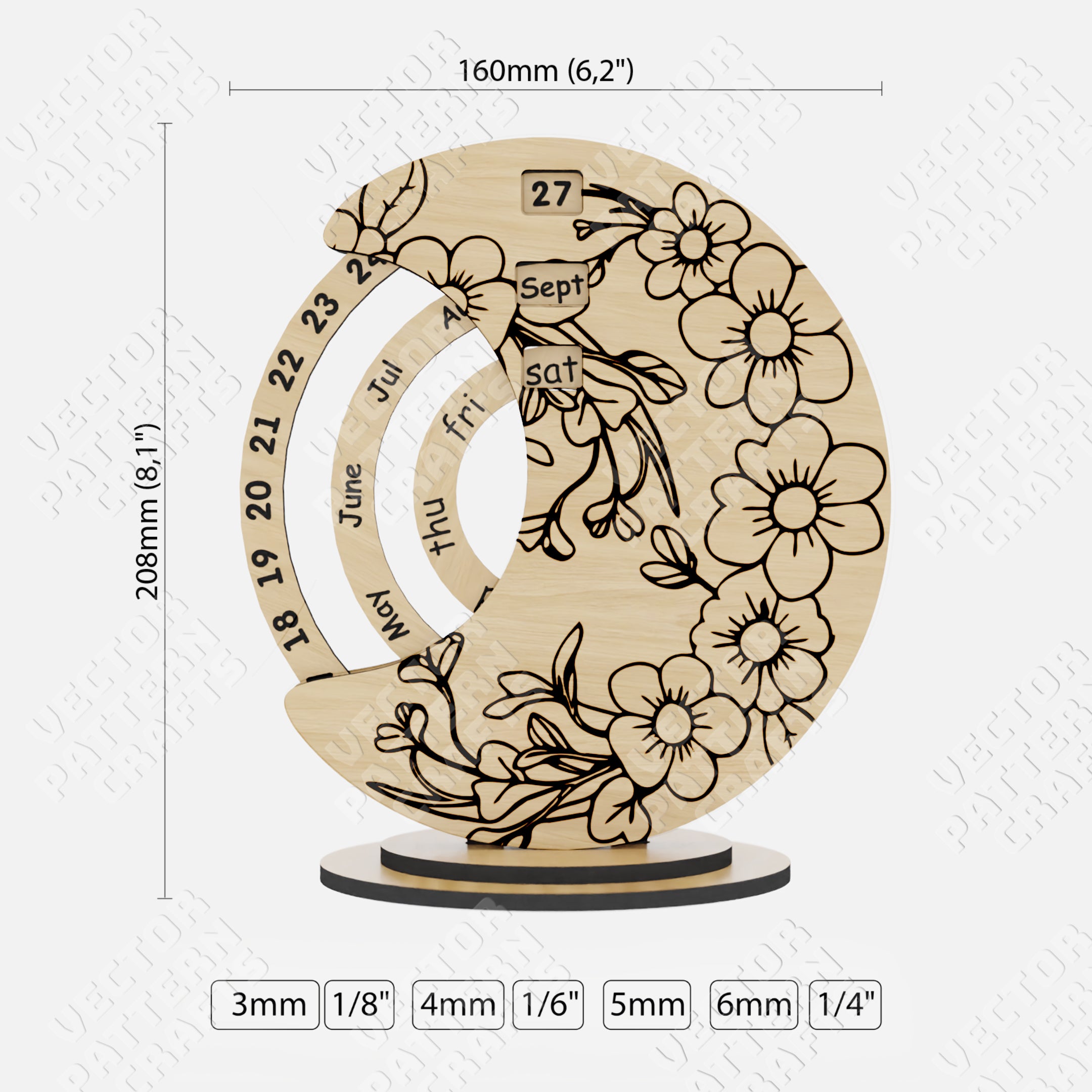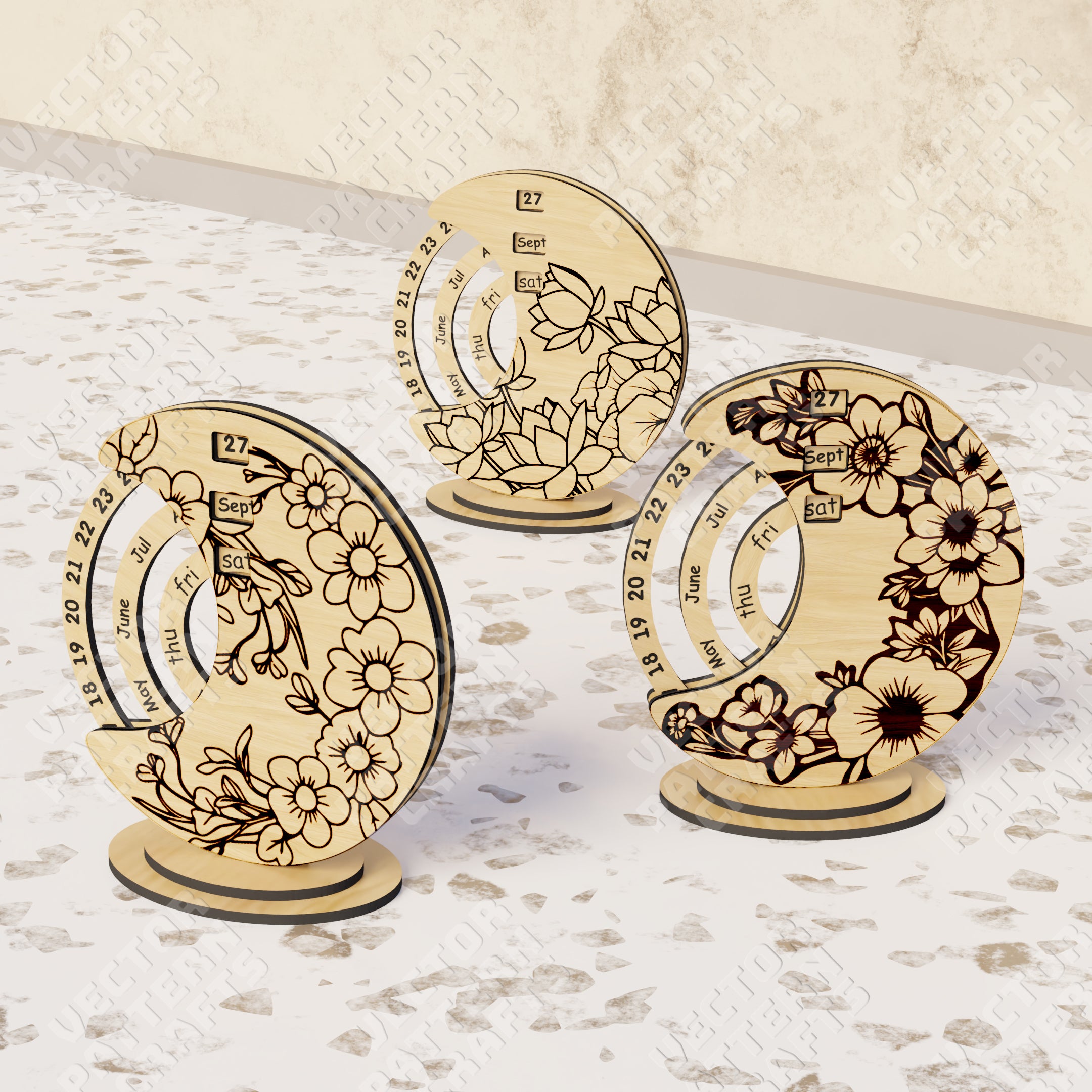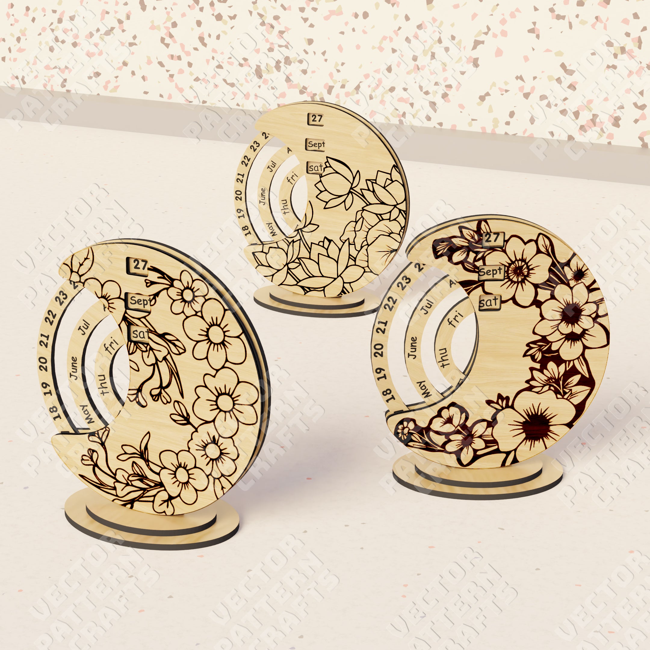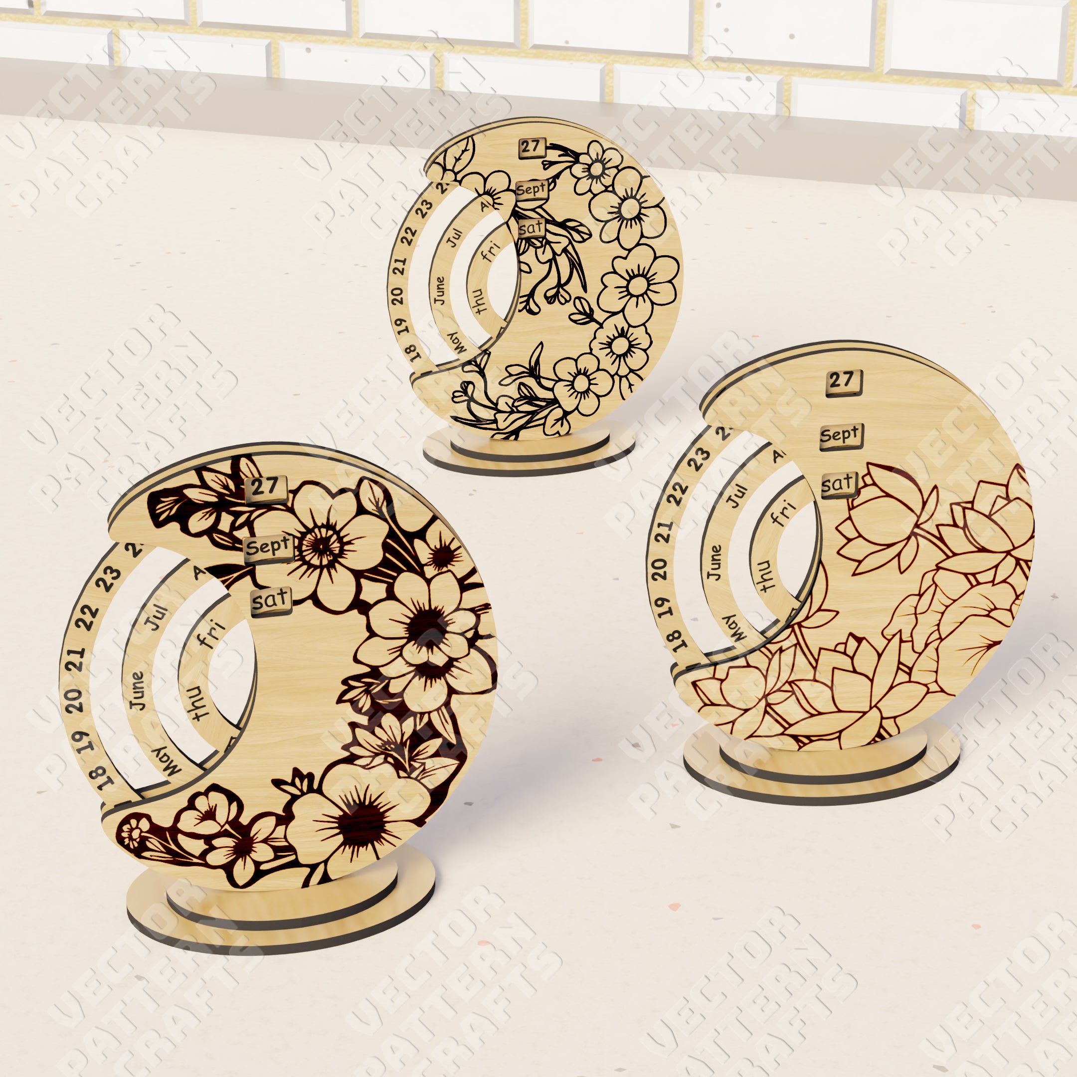 Laser cut Wooden desktop floral perpetual calendar 3 set svg file