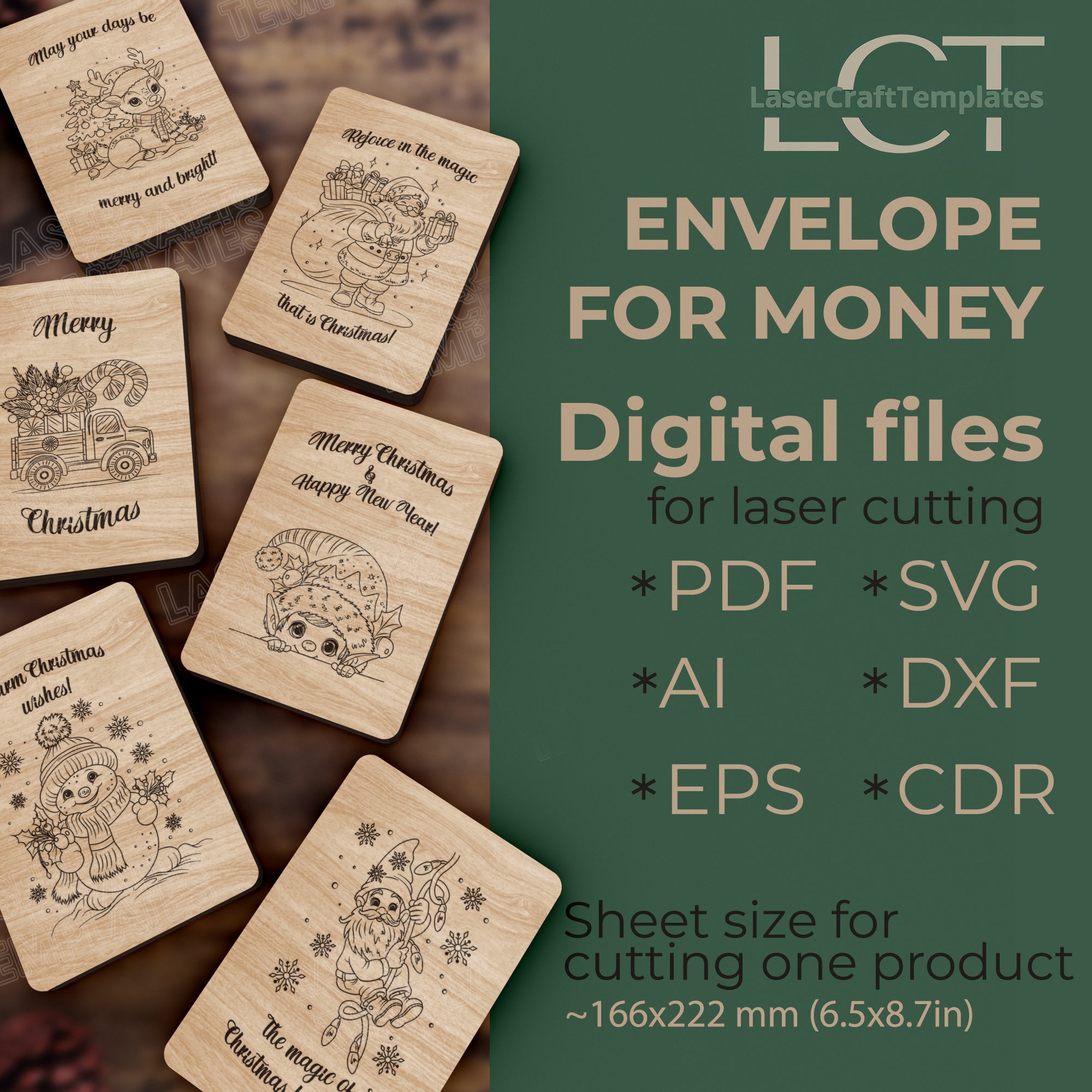 You will receive SVG, DXF, AI, EPS, CDR and PDF files, compatible with most laser cutting software.