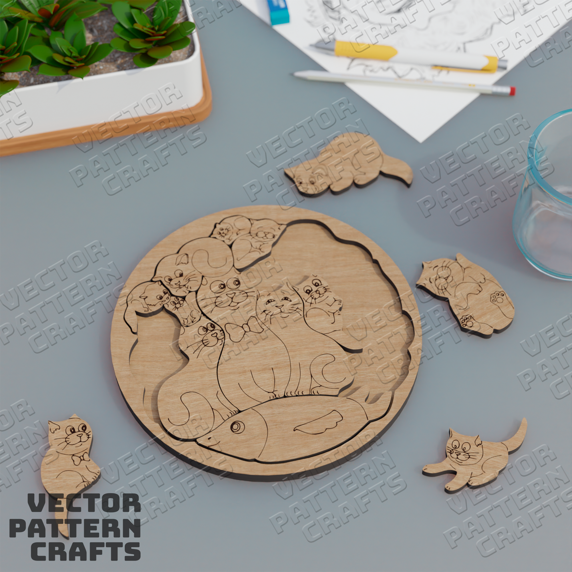Laser cut wooden educational cats puzzle svg file