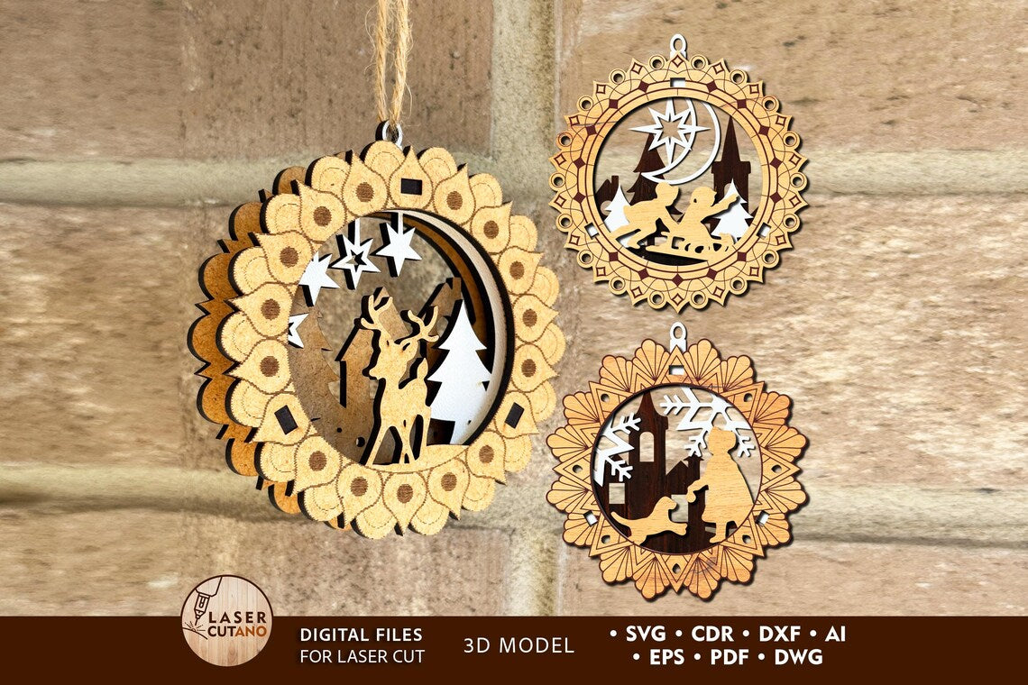 Lasergeschnittene 3D-Weihnachtsornamente 3 Bundle SVG-Datei
