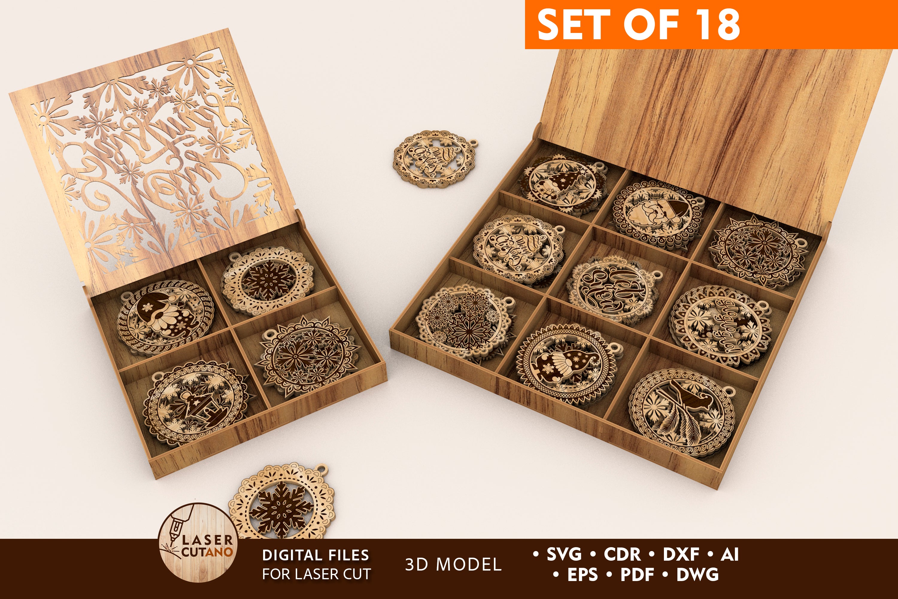 Lasergeschnittene Weihnachtsornamente und 2 Boxen 18 Bundle SVG-Datei