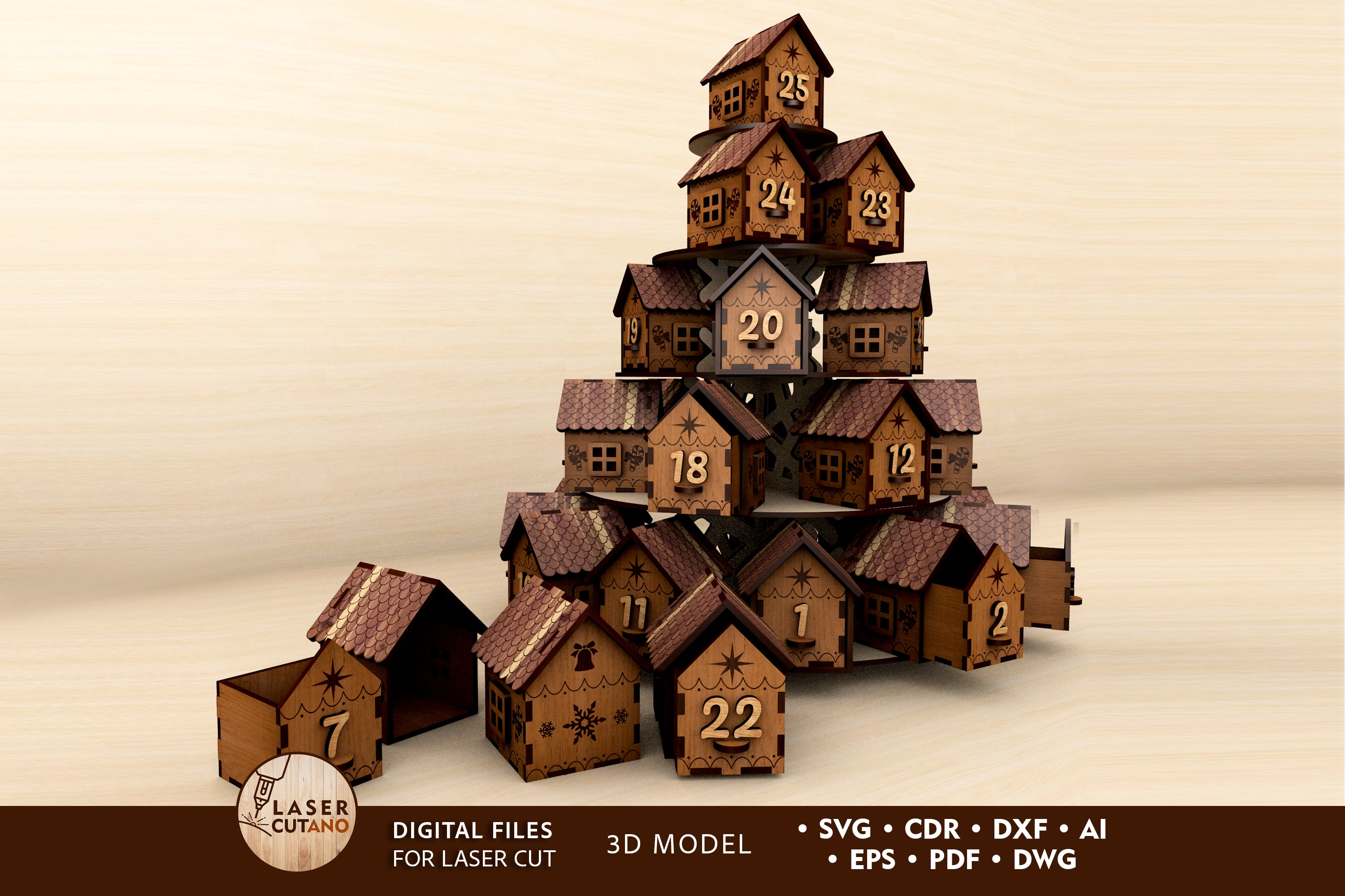 Calendrier de l’Avent de Noël 3D Maisons Fichier SVG découpé au laser