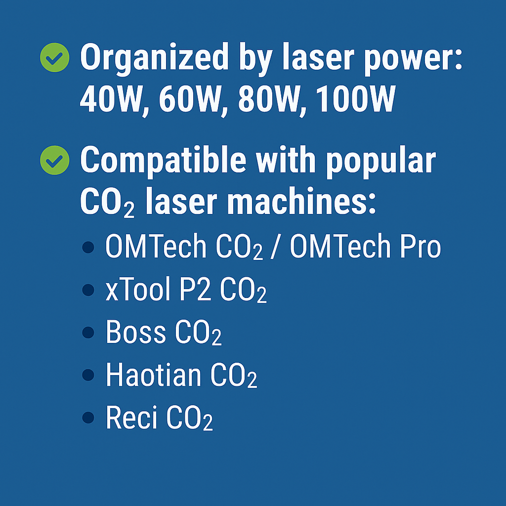 ✔ Organized by laser power: 40W, 60W, 80W, 100W