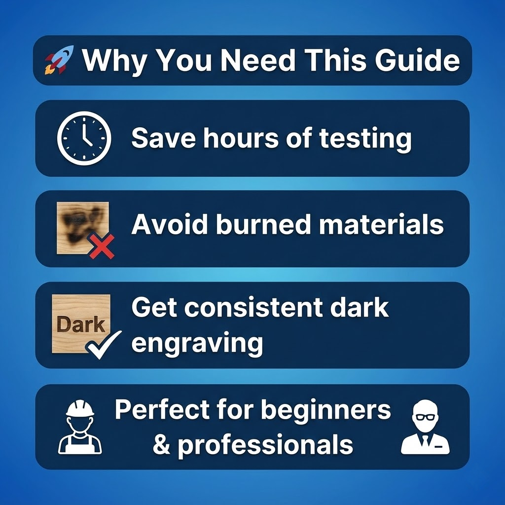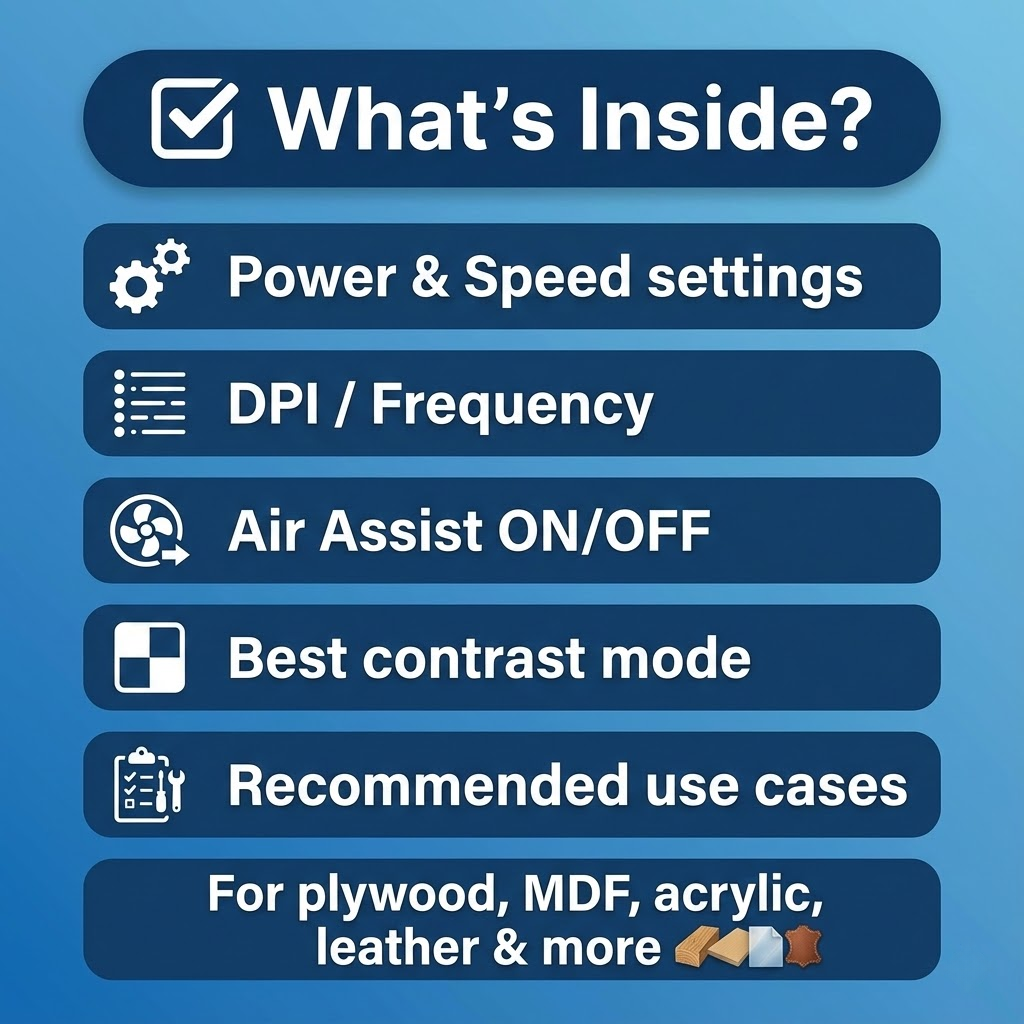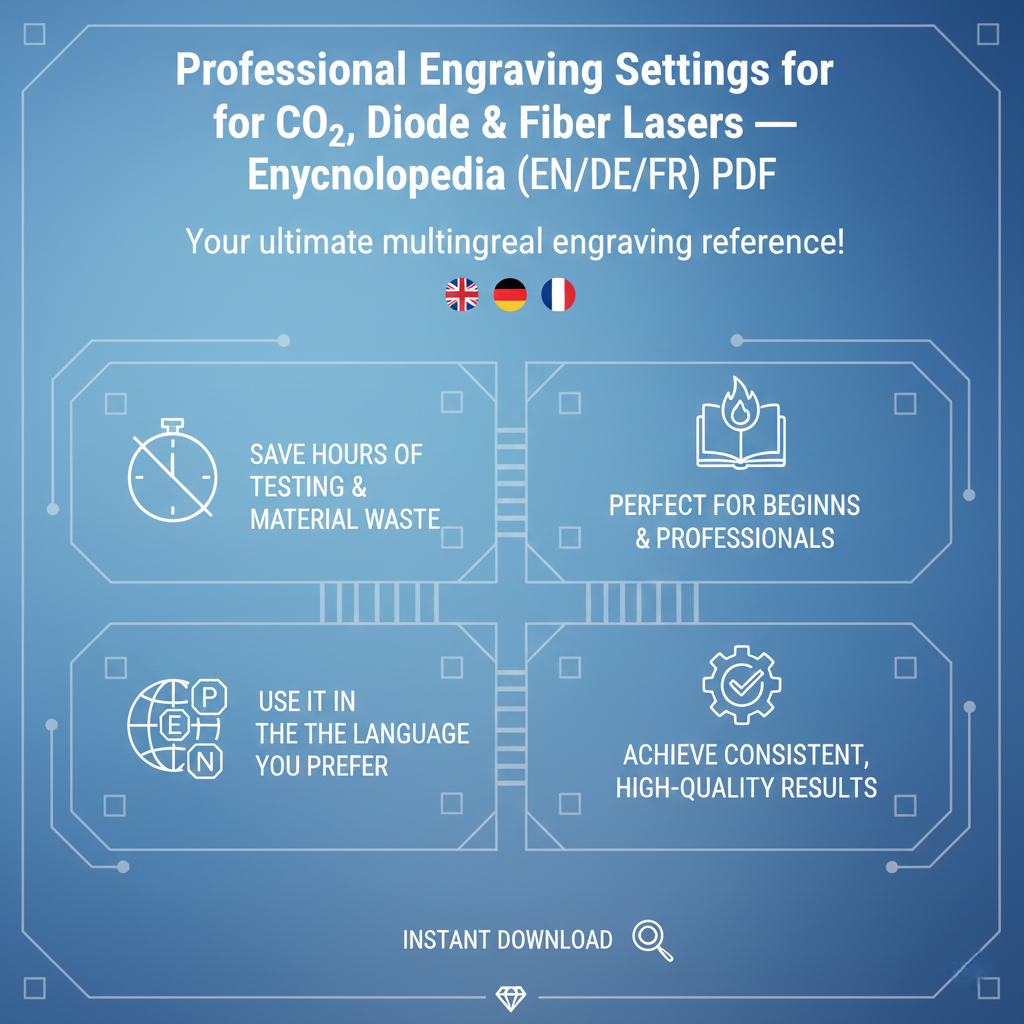 Paramètres de gravure professionnels pour lasers CO₂, diodes et fibre PDF (EN/DE/FR)